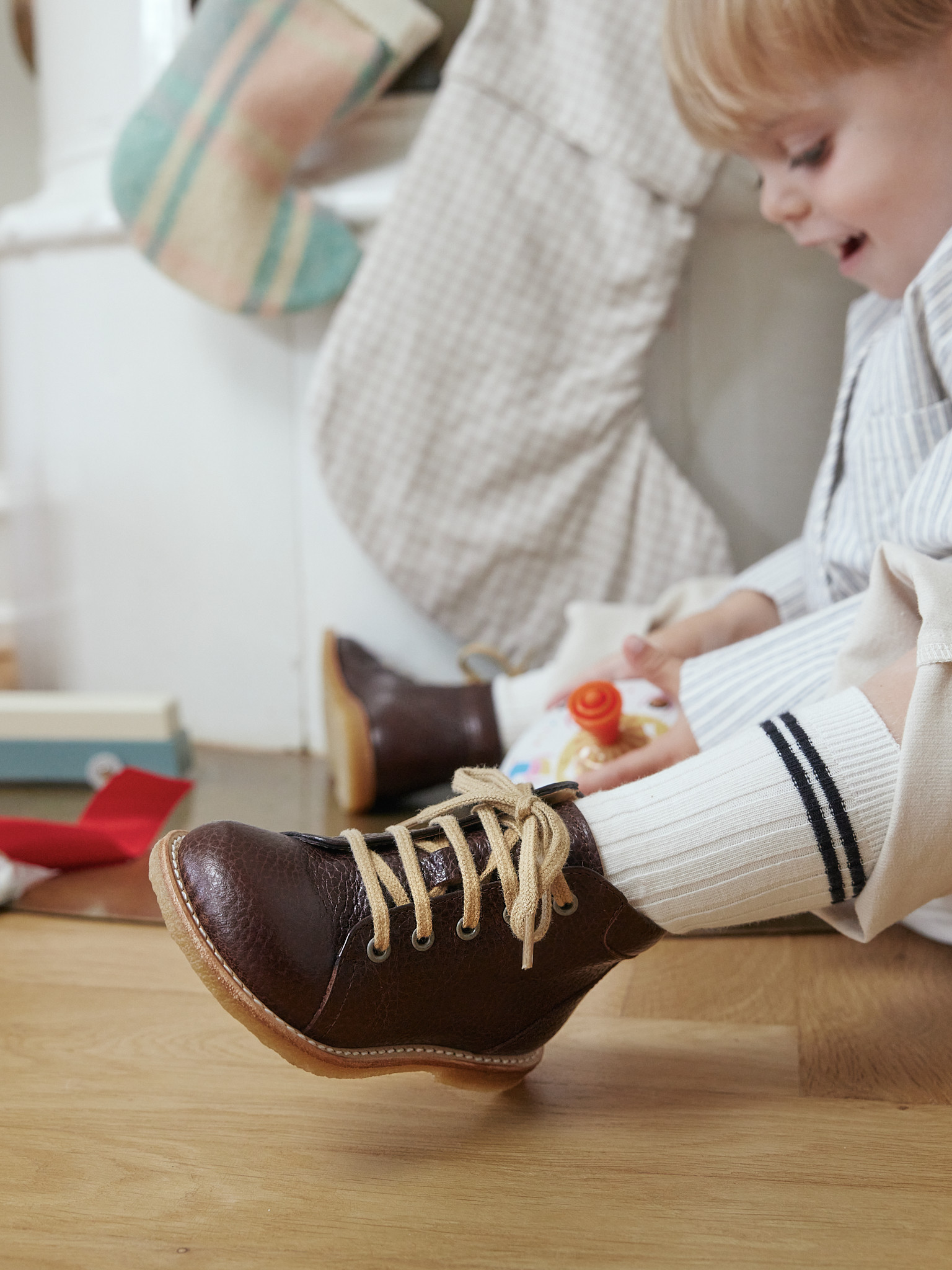 Klassískir og fallegir fyrstu skór frá Angulus sem veita góðan stuðning við hælinn.  Reimar sem auðveldar það að stilla þá rétt að ristinni. Mjúkt og gott krómfrítt leður, einnig að innanverðu. 100% hrágúmmí í sóla.  Þessir eru með breiðari tá en hefðbundna sniðið. Miðlungs til breiðir. Dásamlega góðir skór fyrir þau yngstu í fyrstu skrefunum.