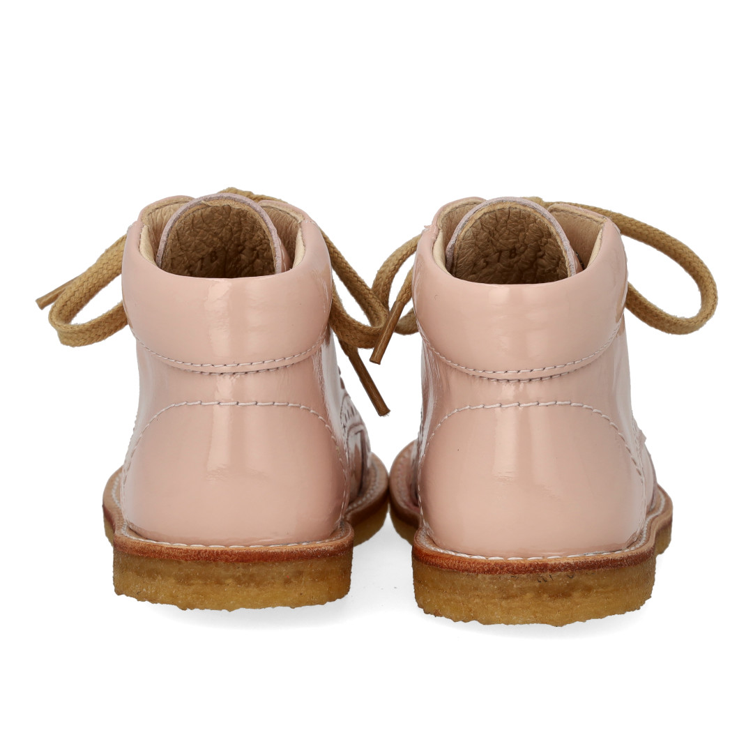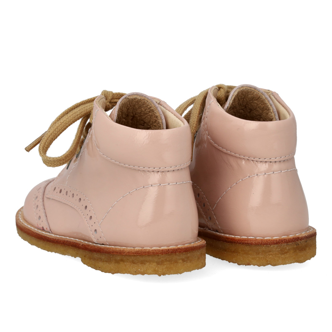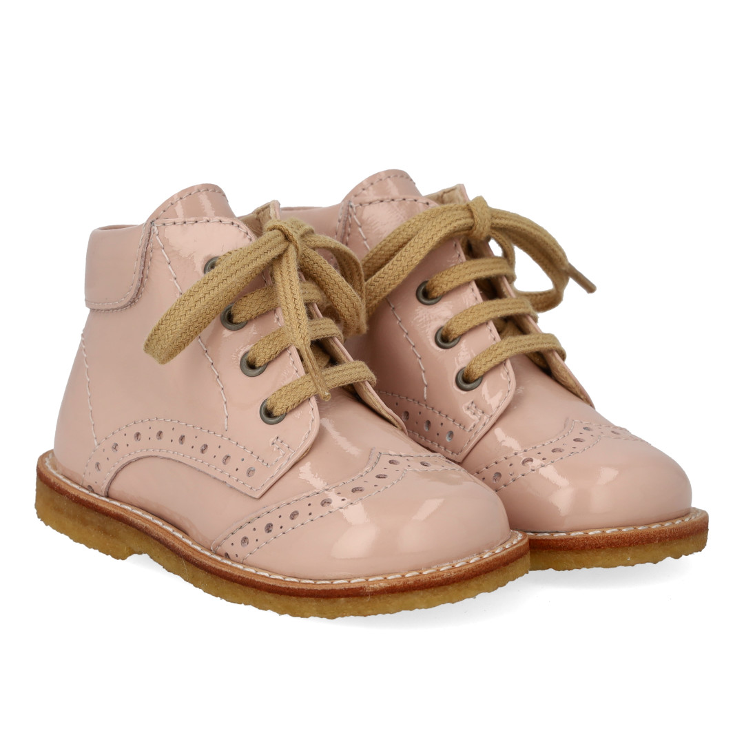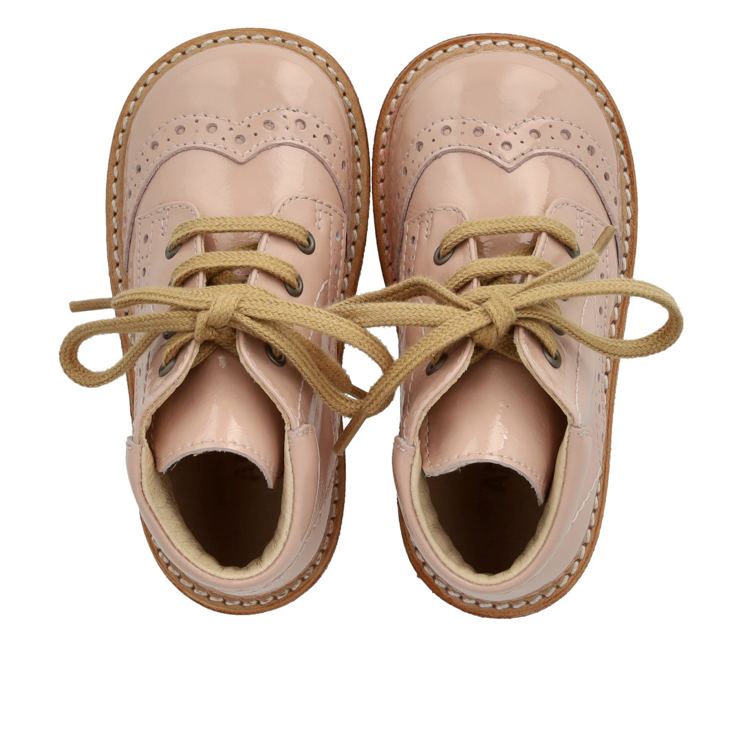 Angulus fyrstu skór úr leðurlakki reimaðir m saum Dusty Almond bleikir glans