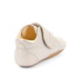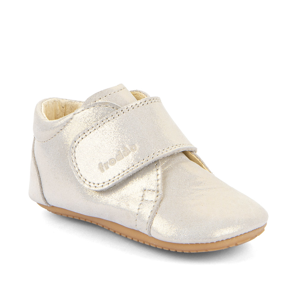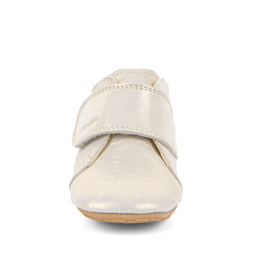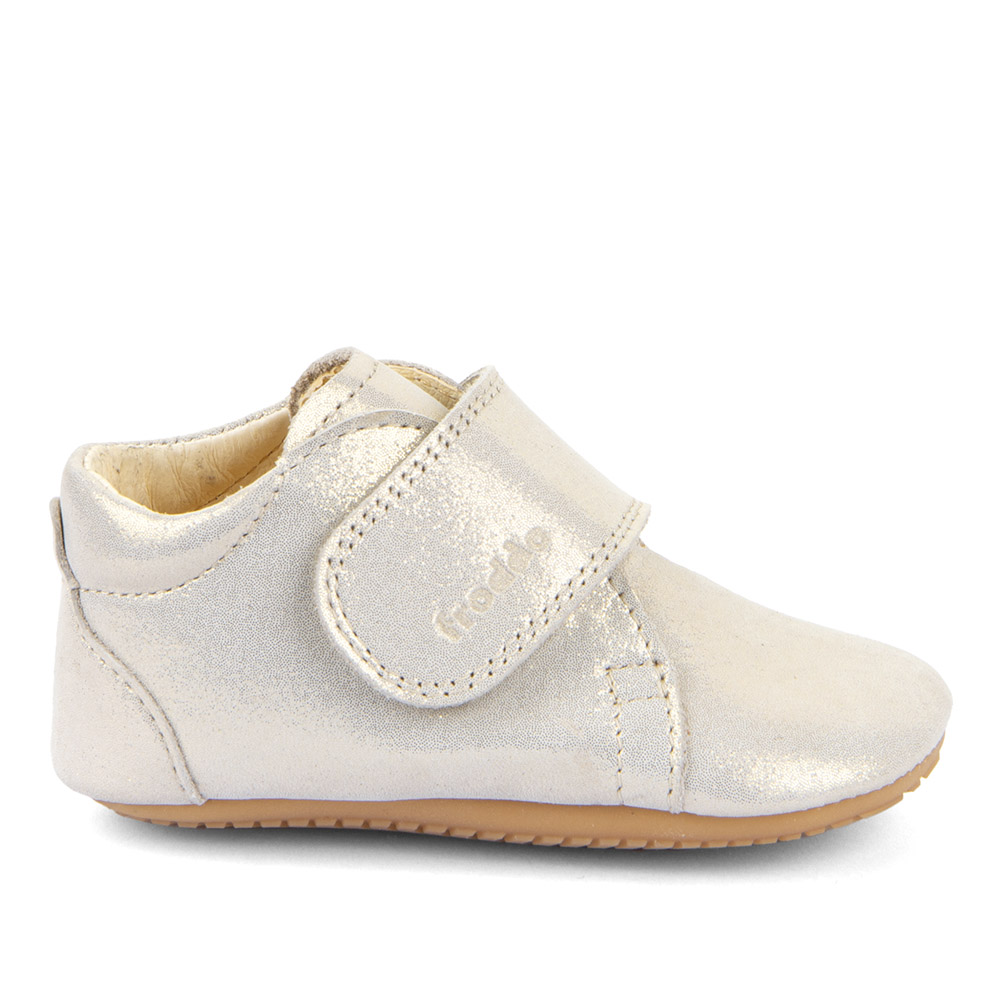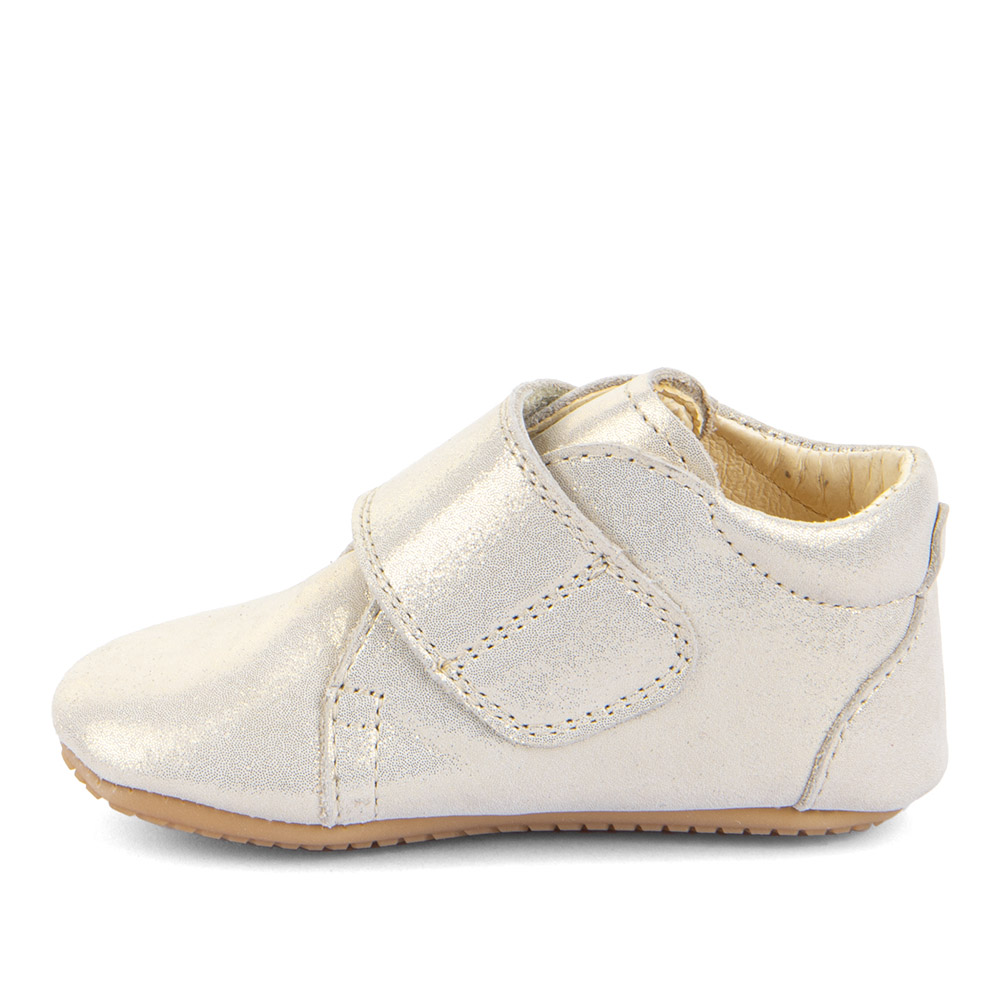 Fallegir og hanskamjúkir skór úr leðri með sem er án króms og skaðlegra efna. Hvítgyllt áferð er á leðrinu. Lokast með frönskum lás yfir rist.  Ytri sóli er úr gúmmíi sem gefur grip. Dásamlegir inniskór fyrir unga fætur. Breiddin er miðlungs.