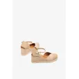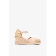 Fallegar og léttar leður espadrillur með hækkandi platformsóla. Platformið er 2cm og hækkun aftast 7,5cm. Lokast með spennu yfir ökklann. Sólinn er einstaklega léttur. Mjög þægilegir og sparilegir skór fyrir sumarið. Breiddin er grönn til miðlungs en v laga að framan sem gefur auka rými fyrir rist.