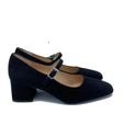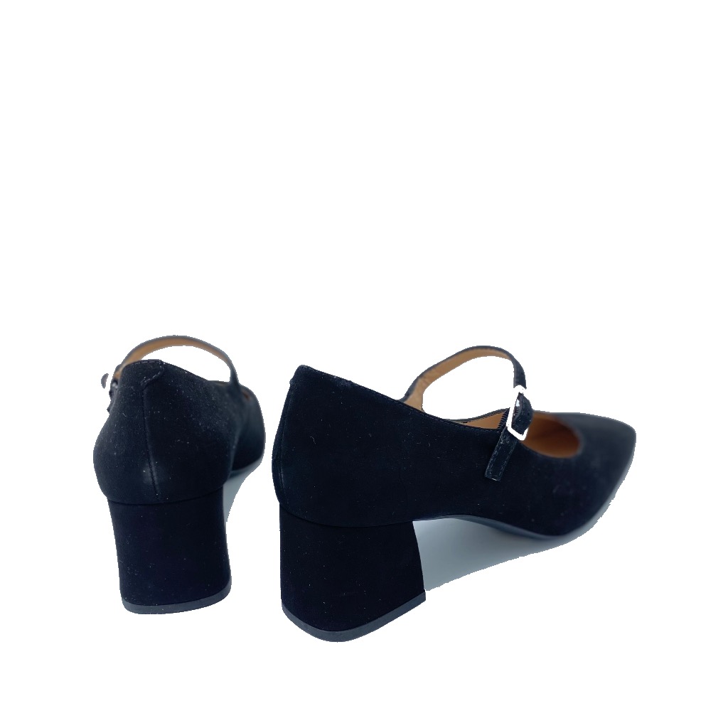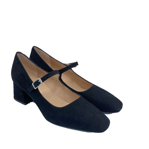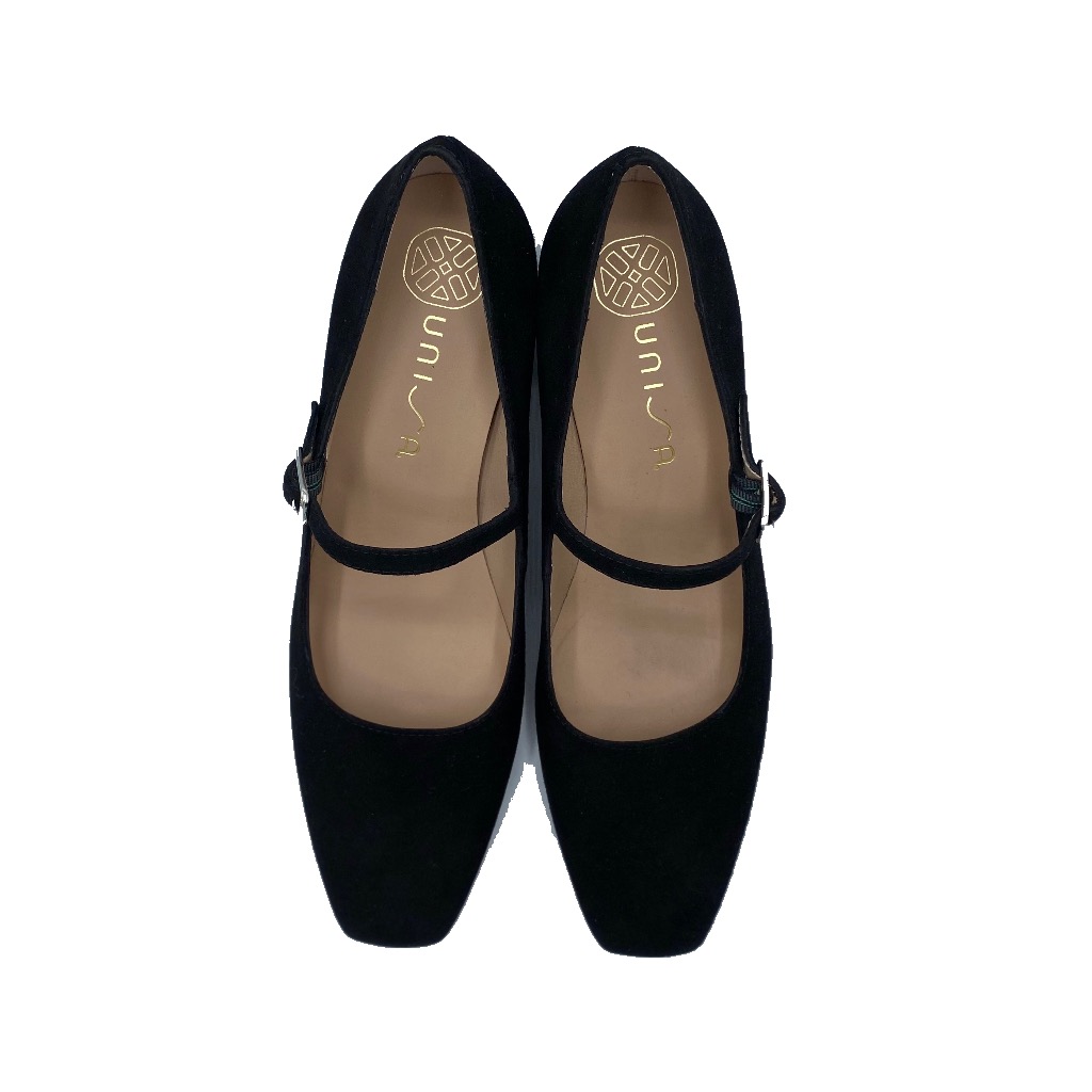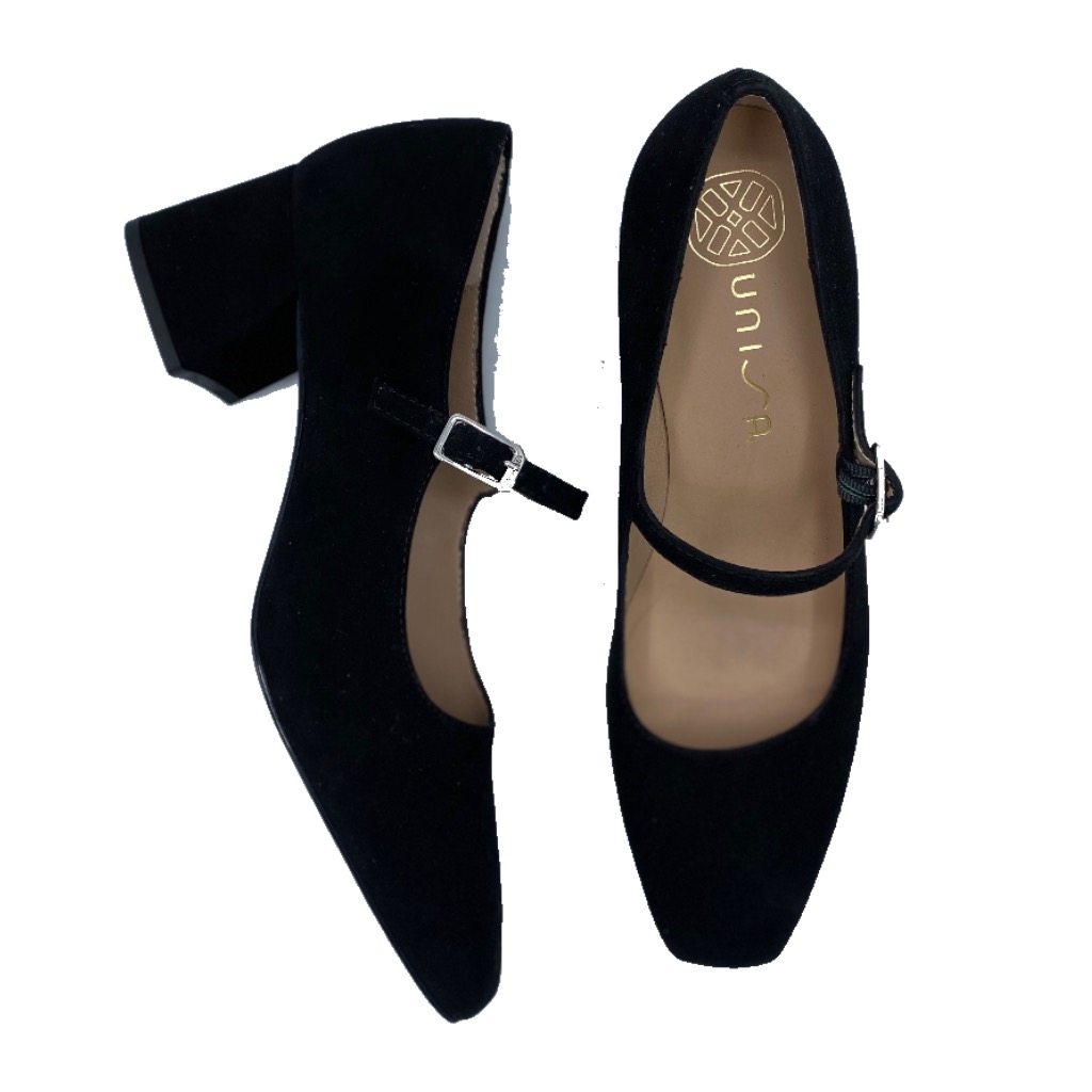 Fallegir Mary Jane skór úr rúskinni með kantaðri tá. Fíngert ristarband sem lokast með stálspennu svo hægte er að stilla að rist. Breiður og þægilegur 5cm hæll sem er yfirdekktur með sama rúskinni. Léttur, sveigjanlegur og stamur (non-slip) gúmmísóli. Einstök klassík frá spænska framleiðandanum Unisa.