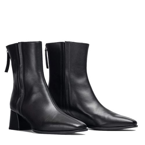 Falleg leður stígvél ökklastígvél með þvertá og rennilás að aftan. Leðurklæddur hæll sem er breiður og 5.5cm hár. Léttur og sveigjanlegur, stamur gúmmísóli. Flottir og þægilegir skór sem hægt er að nota bæði hversdags og spari.