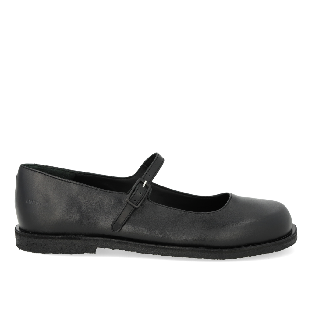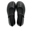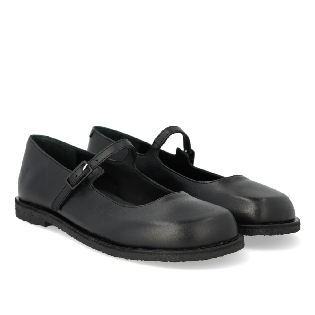 Klassískir Mary Janes skór með breiðu lagi og band yfir rist. Breið rúnnuð tá, mjúkt innlegg, krómfrítt leður að innan og í innleggi, mjótt band sem lokast yfir ristina með metal spennu sem hægt er að stilla af.  Léttur, mjúkur og sveigjanlegur svartur hrágúmmísóli gerir þessa skór einstaklega þægilega. Skórnir eru úr náttúrulegum efnum og anda vel. Falleg dönsk hönnun sem er útfærð með portúgölsku handbragði.
