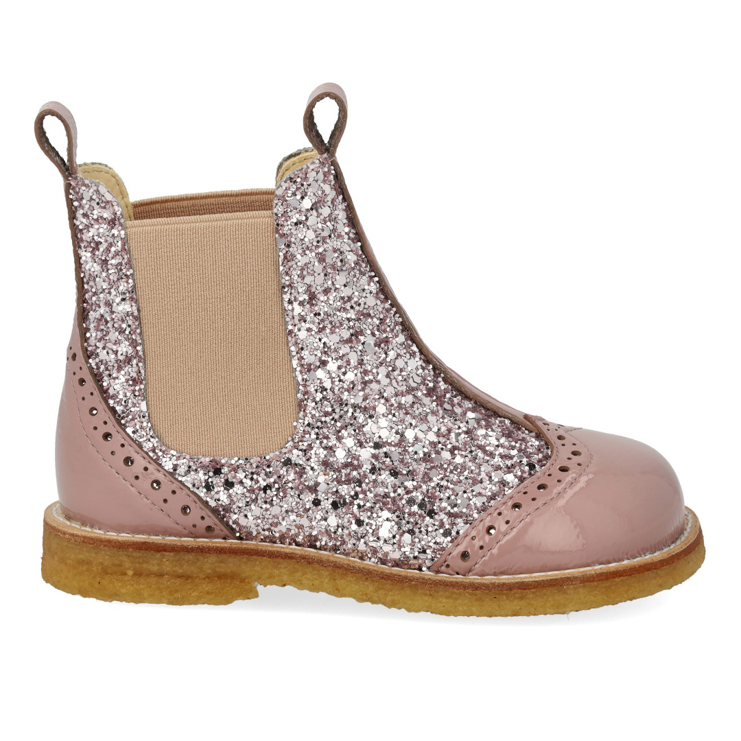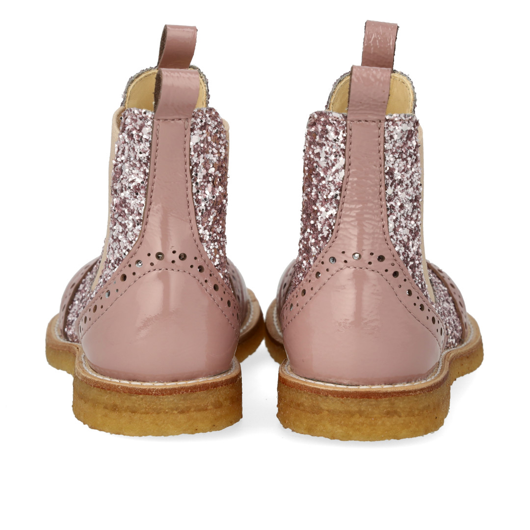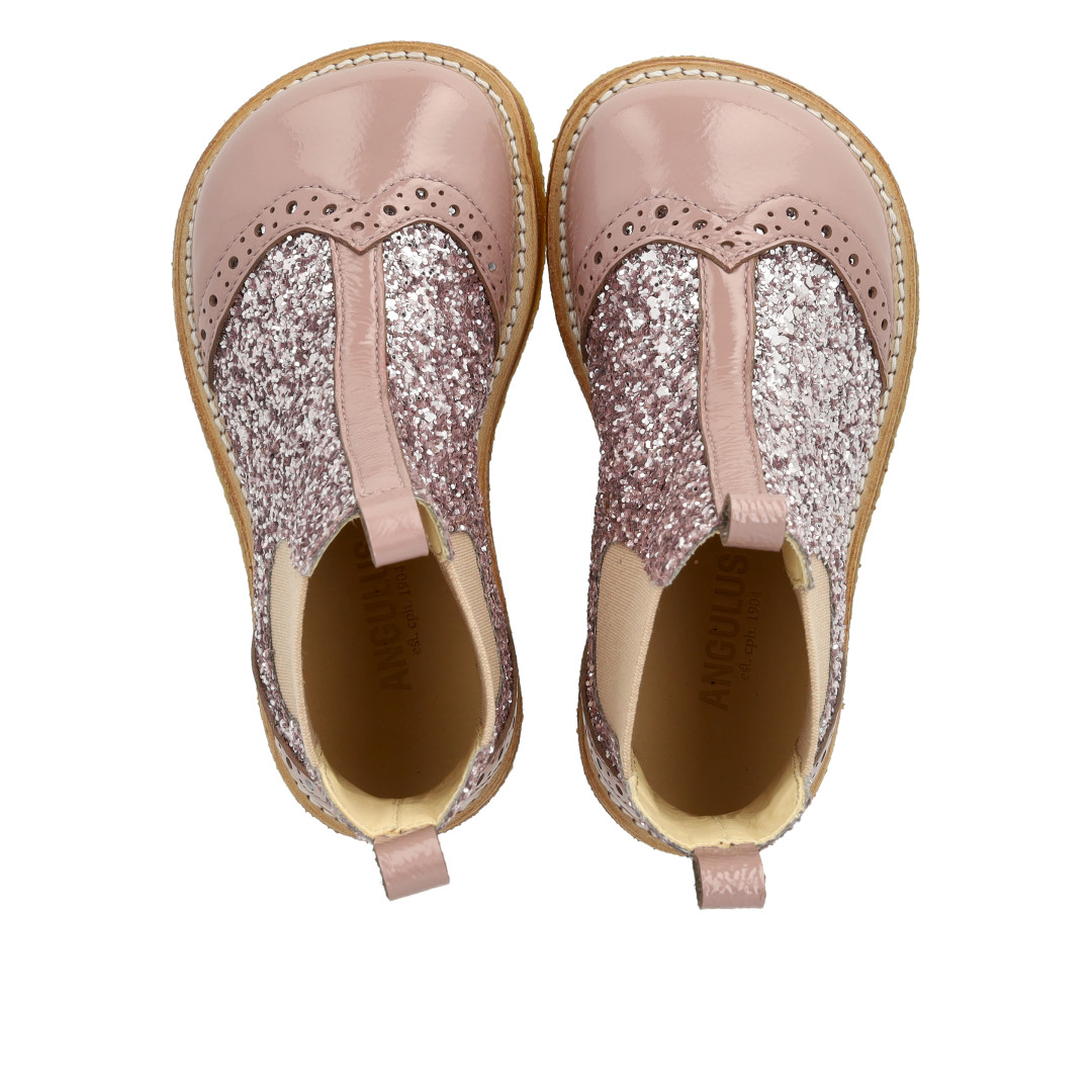 Fallegir og vandaðir ökklaskór úr leðri og leðurlakki. Glimmer áferð á leðri. Leðurklæddir með mjúku leðri að innanverðu og í innleggi. Teygja sitthvoru megin en auðvelt að smeygja sér í.  Breiddin er miðlungs til breið.  Sólinn er úr 100% hrágúmmíi.