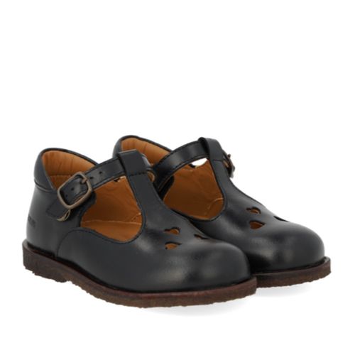 Fallegir t-banda spariskór úr mjúku leðri með spennu yfir rist. Hjarta gatamynstur að ofan. Leðurklæddir að innan og í góðu innleggi. Stífður hælkappi sem styður vel við hæl og ökkla. Sólinn er úr 100% hrágúmmíi. Breiddin er miðlungs.