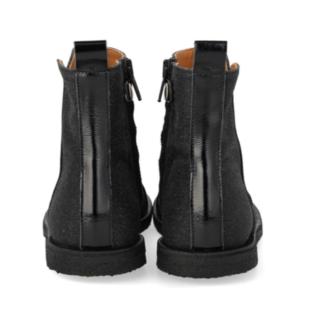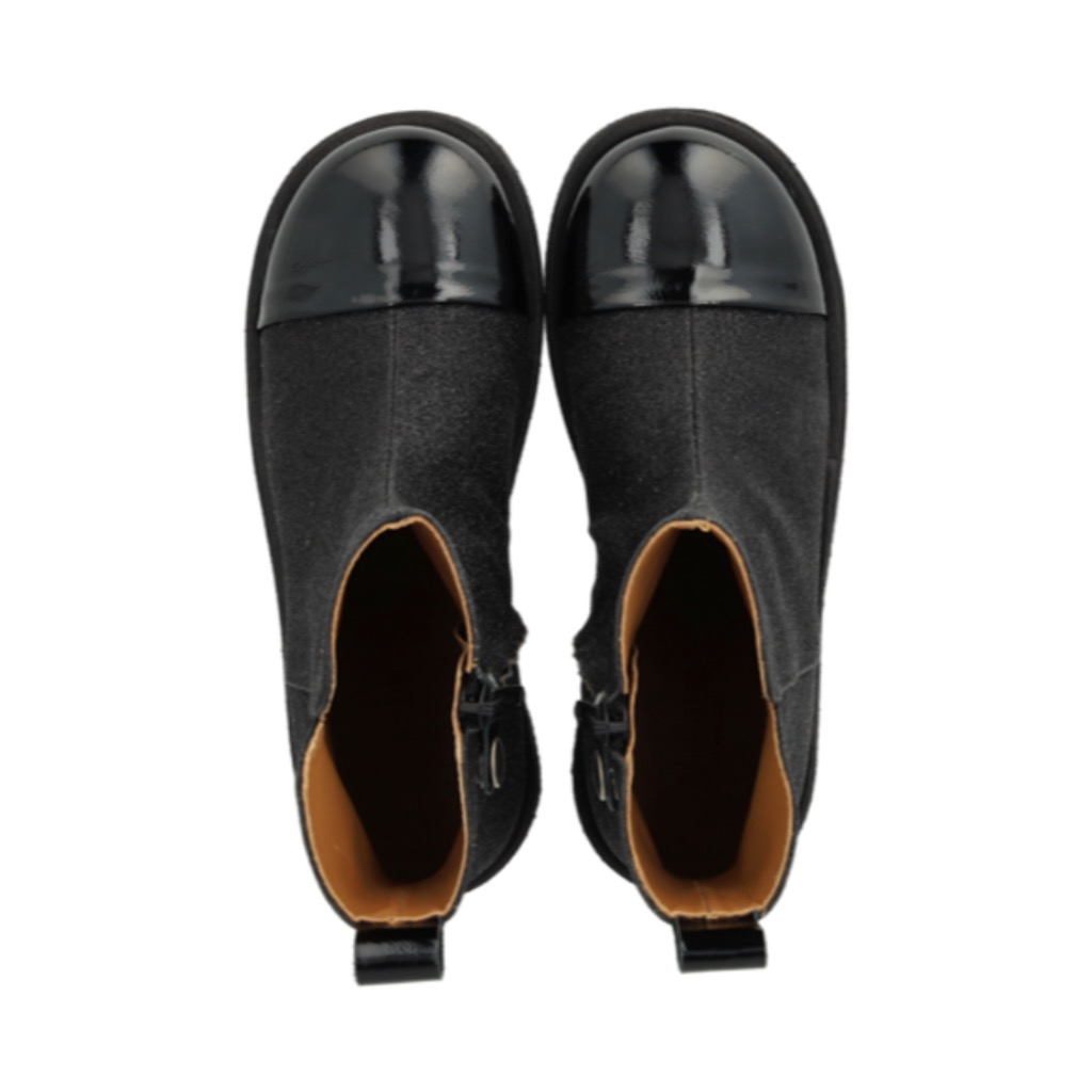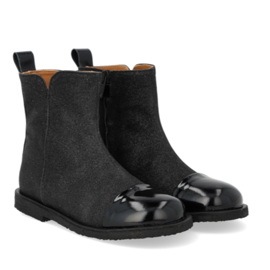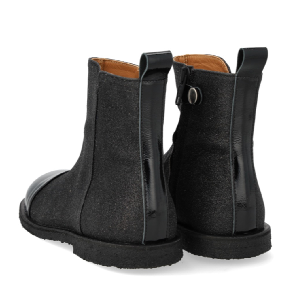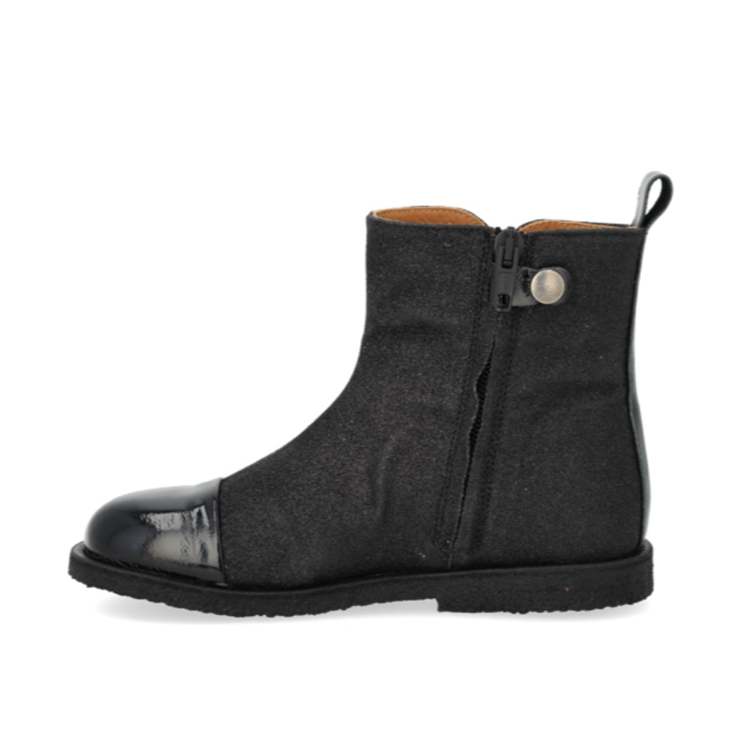 Leður ökklastígvél með glitter áferð (leður og canvas glitter) og rúnnaðri lakktá. Skórnir lokast með rennilás að innanverðu með smellu yfir.  Styrktur hælkappi til að auka þægindi og stuðning.  Leður að innan og í innleggi er krómfrítt. Léttur og sveigjanlegur hrágúmmísólinn er með FSC-vottun. Skórnir eru gerðir úr náttúrulegum efnum sem anda vel. Falleg dönsk hönnun í bland við portúgalskt handbragð. Við mælum með vaxtabili 1-1,2cm fyrir framan stóru tá ef hæll er alveg aftast á innleggi.