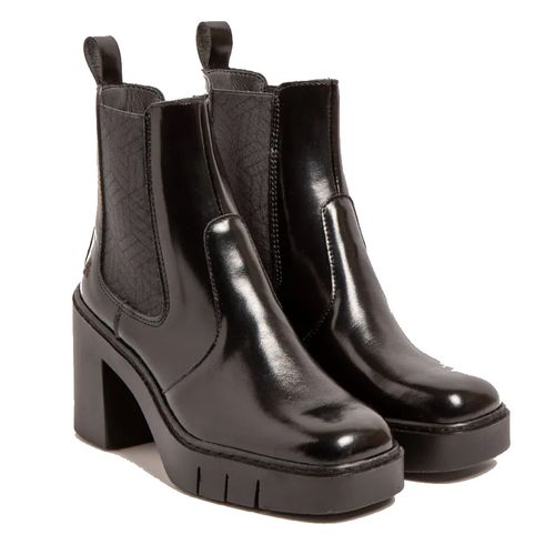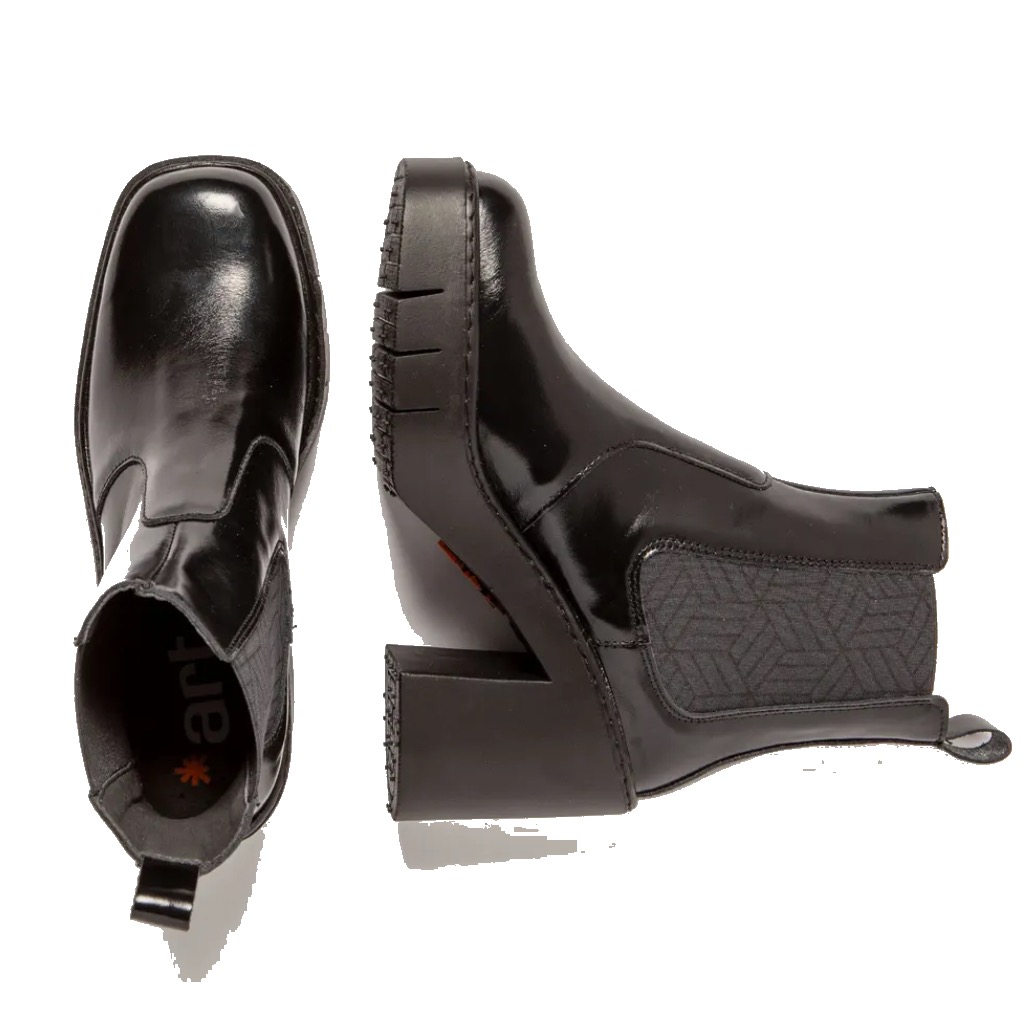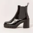 Geggjaðir platform ökklaskór úr glansandi leðri með teygju báðum megin. Teygjan er með svörtu geo mynstri. Leður að innan og rakadrjúgt microfiber efni í innleggi sem endist lengur. Skórnir eru með þvertá sem gerir þá ekki bara flotta heldur einnig þægilega þar sem þeir eru með meiri breidd. Hællinn er 6.5cm hár. Geggjaðir skór sem hægt er að nota við alls kyns fatnað, spari og hversdags.