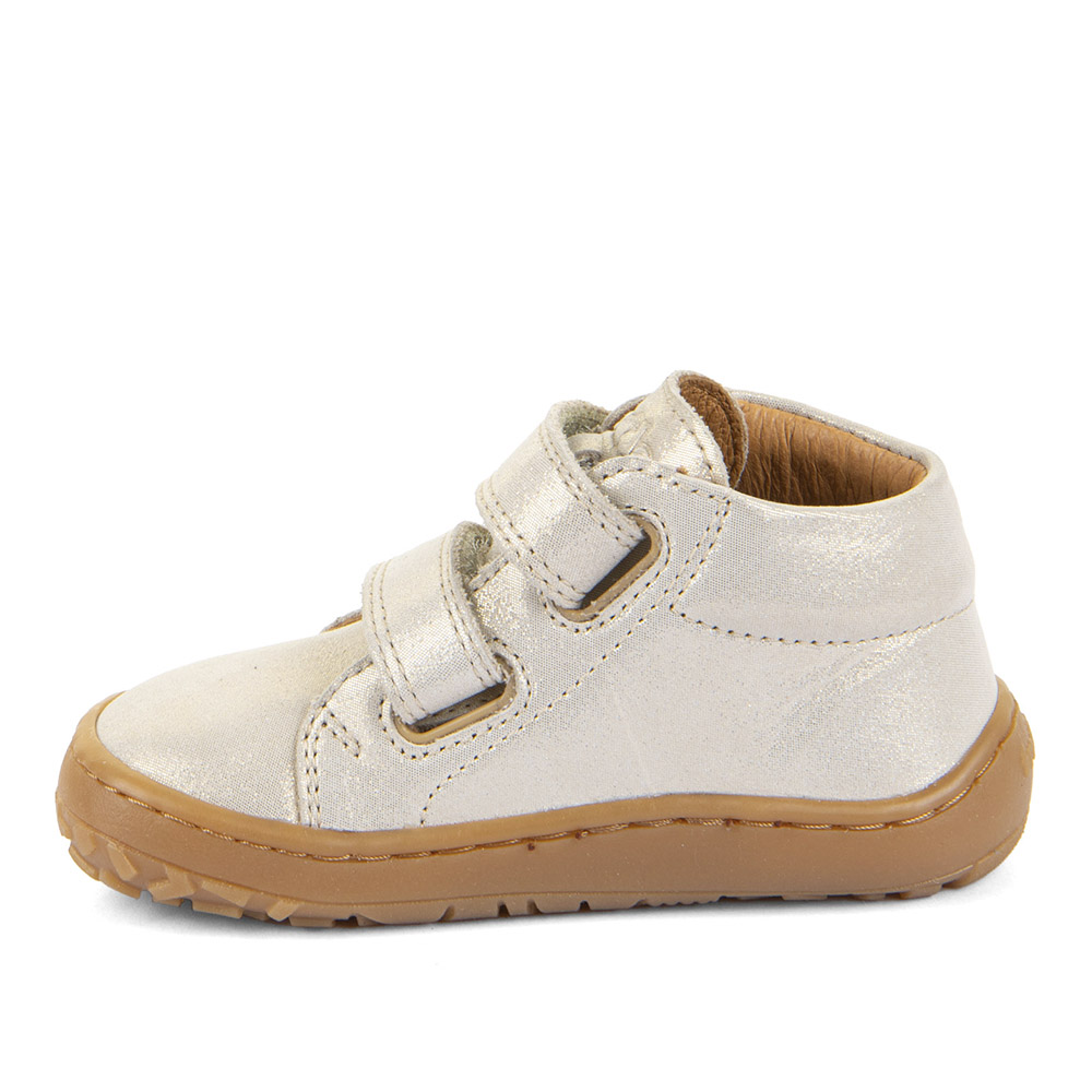 Vinsælu Barefoot uppháu skórnir með fallegri glansgylltri áferð. Þessir dásamlegu Barefoot skór eru úr mjúku leðri og lokast með 2 frönskum lásum svo auðvelt sé að stilla á rist . Táin er fótlaga, breið og góð. Breiddin hentar því velflestum. Skórnir eru klæddir með krómfríu leðri að innanverðu og með bakteríuhamlandi (antibacterial) leðurinnleggi sem er laust. Sólinn, sem er úr gúmmíi með góðu gripi, er alveg flatur (zero drop) og vel sveigjanlegur. Hælkappinn er passlega mjúkur. Frábærir skór allan ársins hring.
