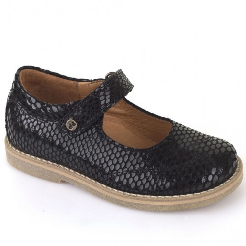 Fallegir spariskór úr leðri með Python mynstri, ristarband lokast með frönskum lás.  Góður stuðningur við hæl (hælkappi). Gott leðurinnlegg í sólanum og ytri sólinn er úr gúmmíi. Breiddin hentar flestum.