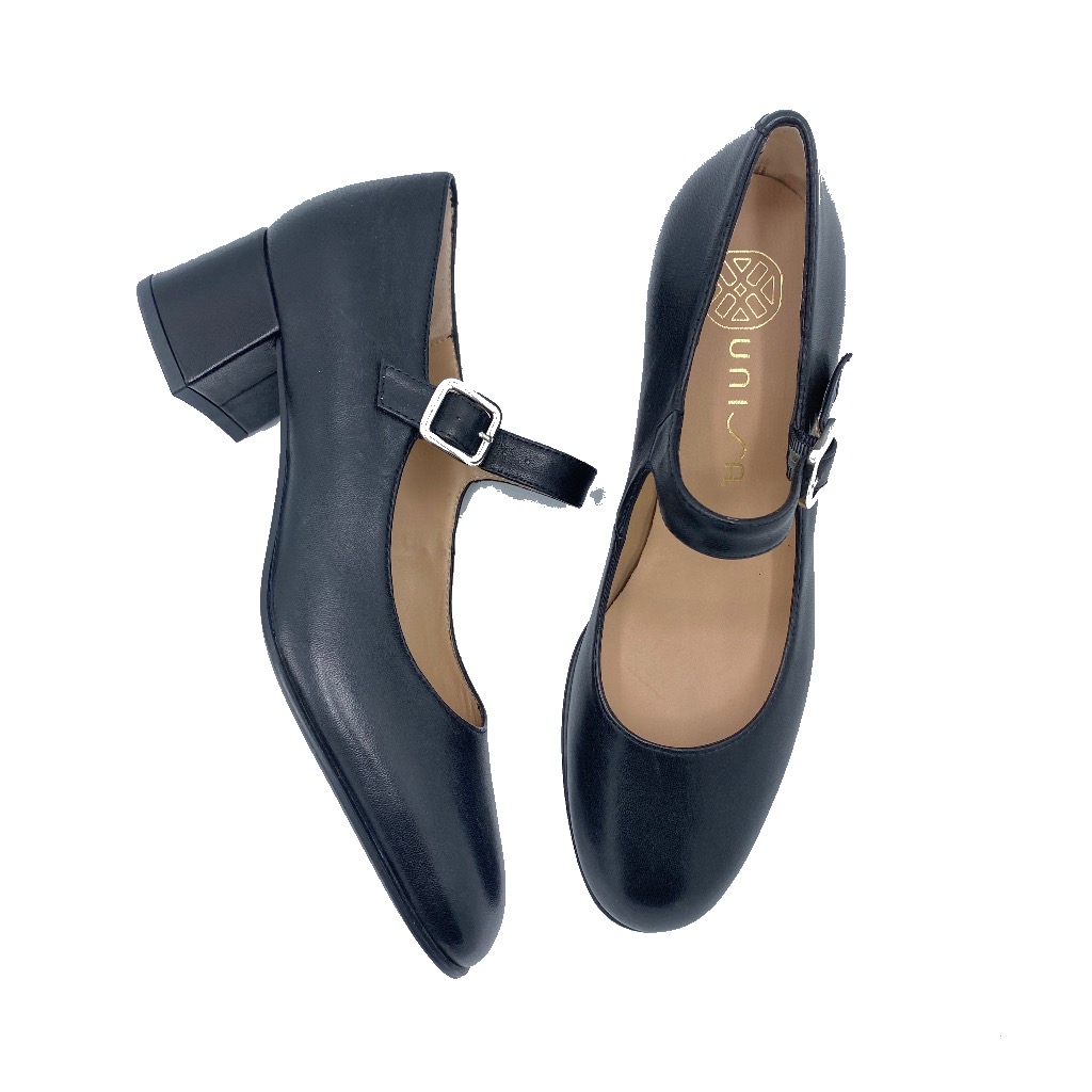 Mjúkir og fallegir, klassískir spariskór með 4.5cm háum hæl sem er breiður. Leðurklæddir að innan og í innleggi. Lokast með spennu yfir rist. Rúnnuð tá. Breiddin er miðlungs og hentar flestum. Sólinn er með gúmmíi í sem gerir þá ekki eins hála. Fallegir skór við spariklæðnaðinn, frá spænsku smiðju Unisa.